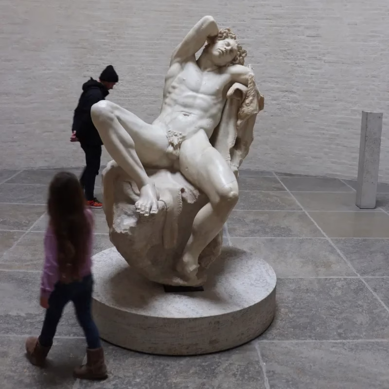 From a distance, and even fairly close up, this sculpture looks like a young man lying back with his legs wide open and genitals exposed. Only a small horsetail reveals it is a satyr and not a human making it quite OK in antiquity art to have your sexual organs on display.