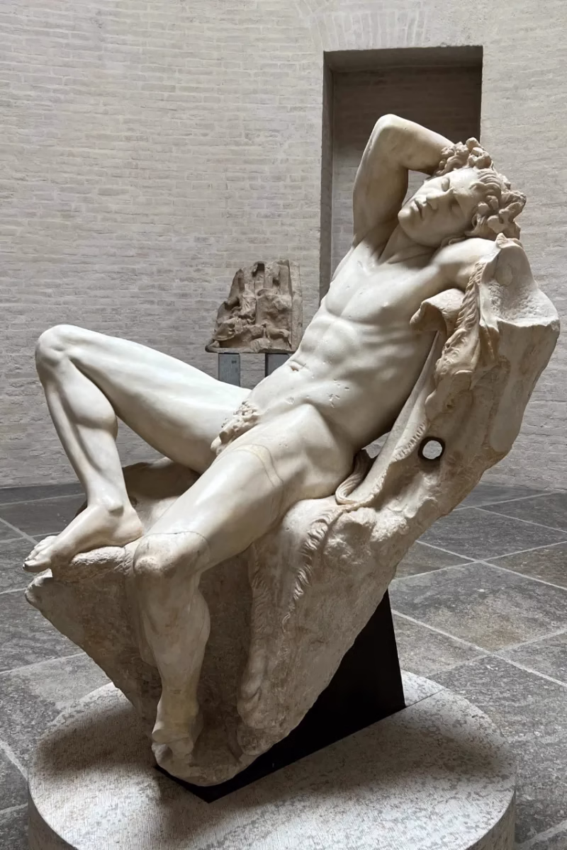 From a distance, and even fairly close up, this sculpture looks like a young man lying back with his legs wide open and genitals exposed. Only a small horsetail reveals it is a satyr and not a human making it quite OK in antiquity art to have your sexual organs on display.