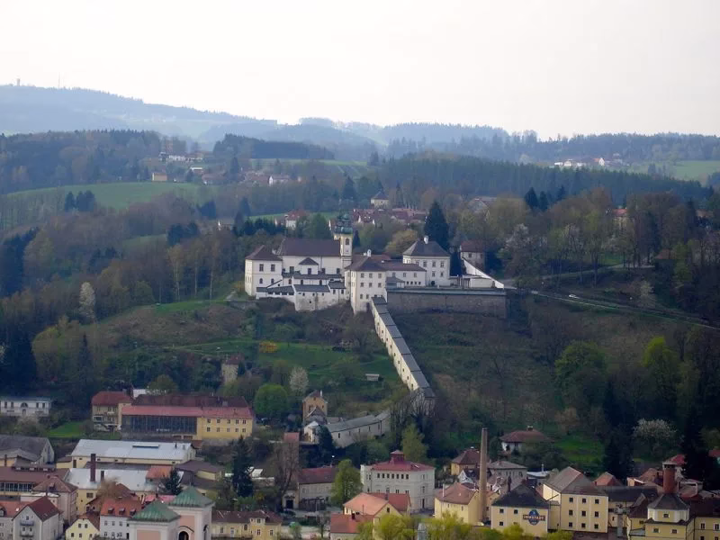Wallfahrtkirche Kloster Mariahilf (Pilgrim’s Church of Maria Helped Monastery) in the Innstadt of Passau viewed from the Veste Oberhaus in the Ilzstadt. Note the covered walkway with 321 steps – its walls are decorated with paintings and other religious offerings.