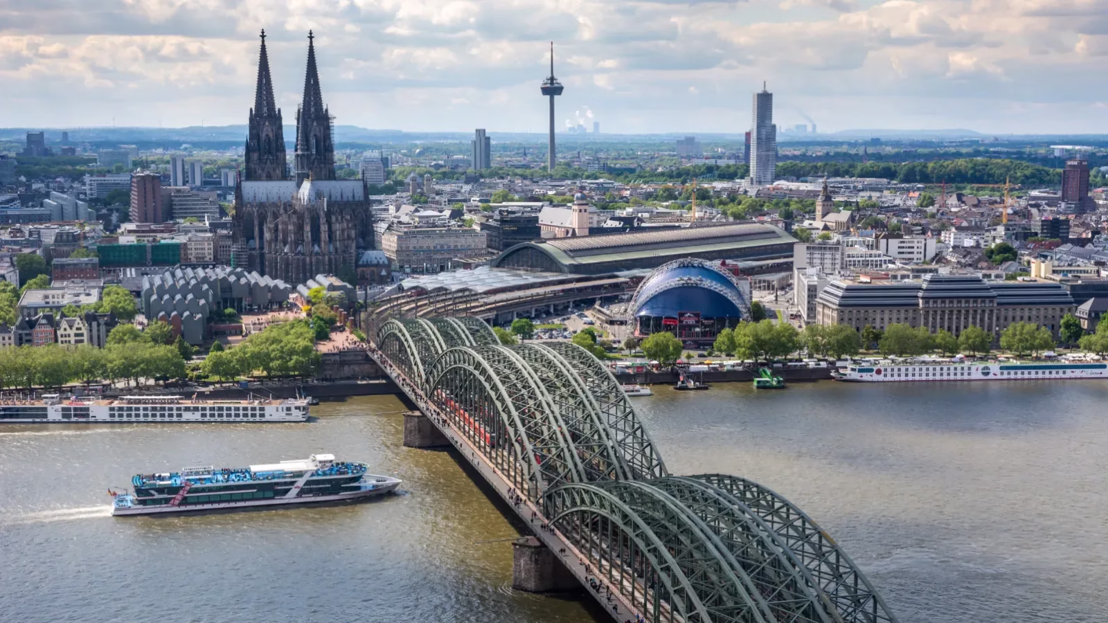 COLOGNE, GERMANY – MAY 12: Cityscape of Cologne, Germany on May 12, 2019. View from Triangle tower to the cathedral and Hohenzollern Bridge.