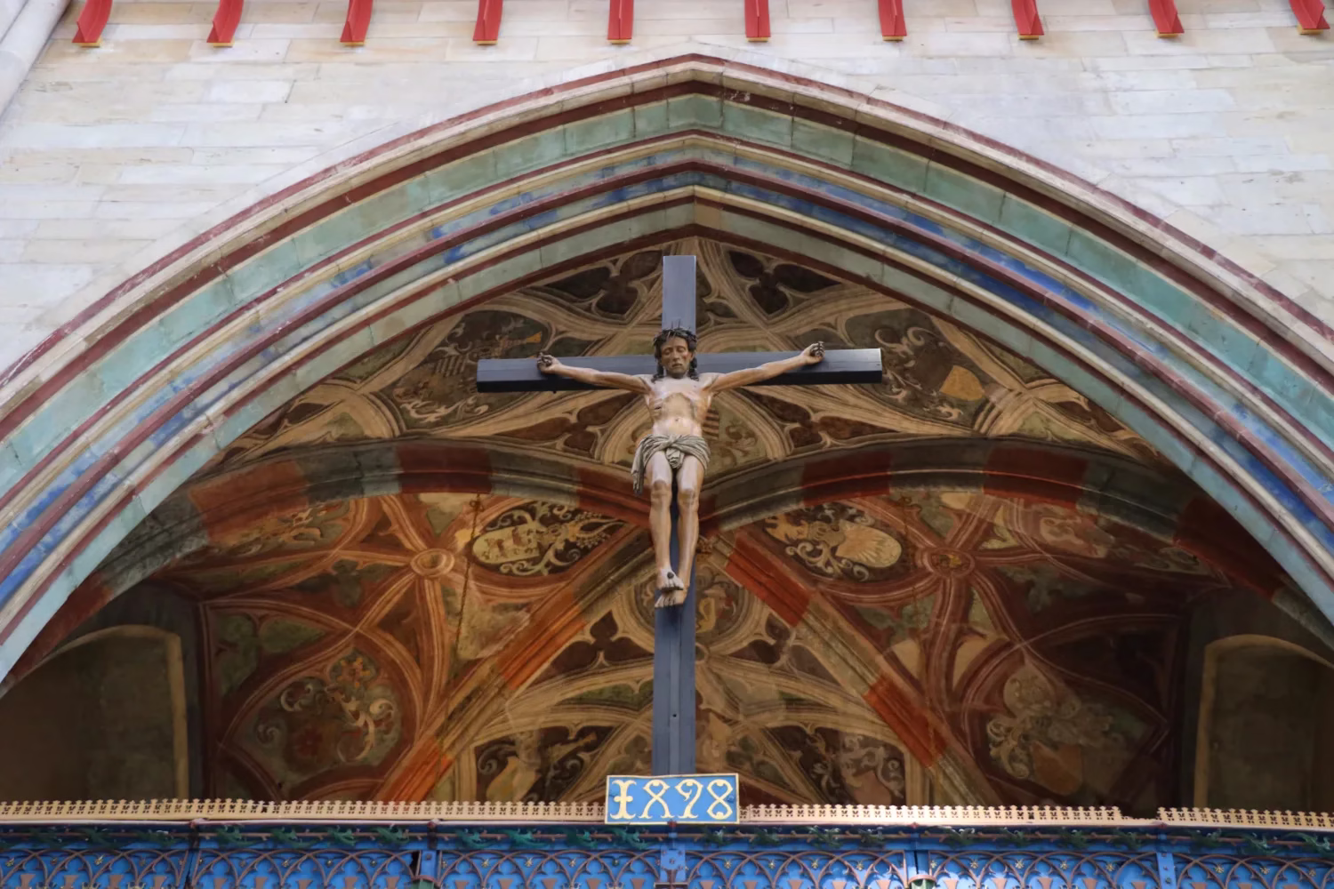 The western portal has been mostly out of use since Archbishop Ernst of Saxony, who died in 1515, converted it into his grave chapel. The bronze tomb by the Nuremberg master Peter Fischer was already cast two decades before the bishop’s death. The tomb, another sculpture of St Maurice, and a candelabra in this chapel are of high artistic quality but meant that the western portal is rarely used for admission to the building.