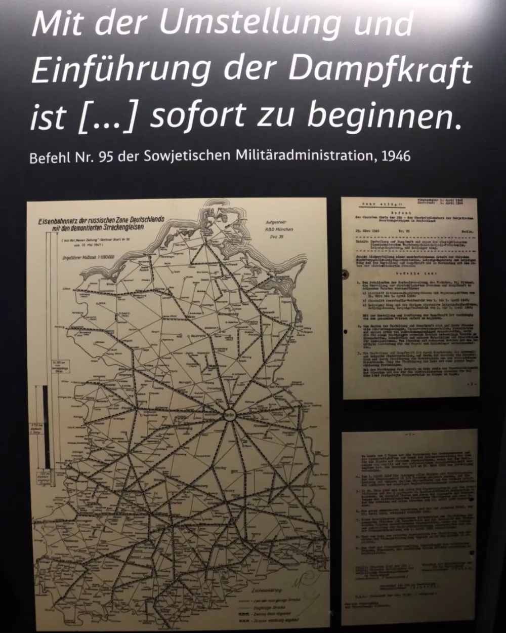 Order Nr 95 from the Soviet Military Administration, 1946 — an immediate start with the change to steam power. The Soviets ripped up electric railway networks and other equipment was taken to the USSR as war reparations.