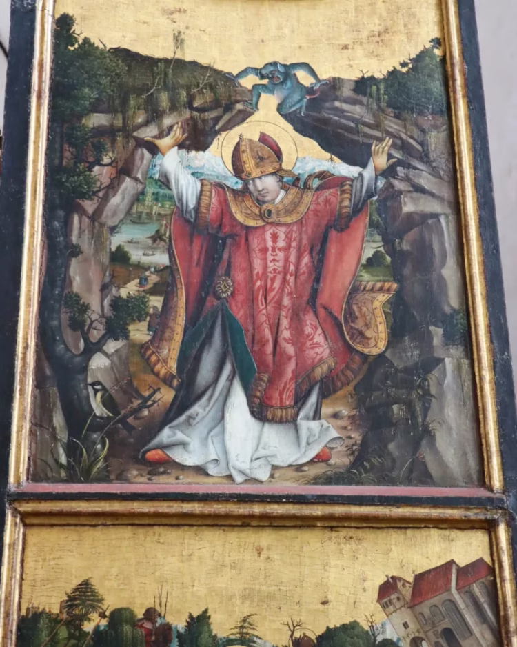 The main altar is dedicated to St Wolfgang, the patron saint of shepherds. The paintings on the inside of the wings are scenes from the life of St Wolfgang. Note top right how the saint keeps two mountains in position despite the attempt of a devil to push the rocks down. The small chapel (in the bottom right) is the St Wolfgang’s Church in Rothenburg.