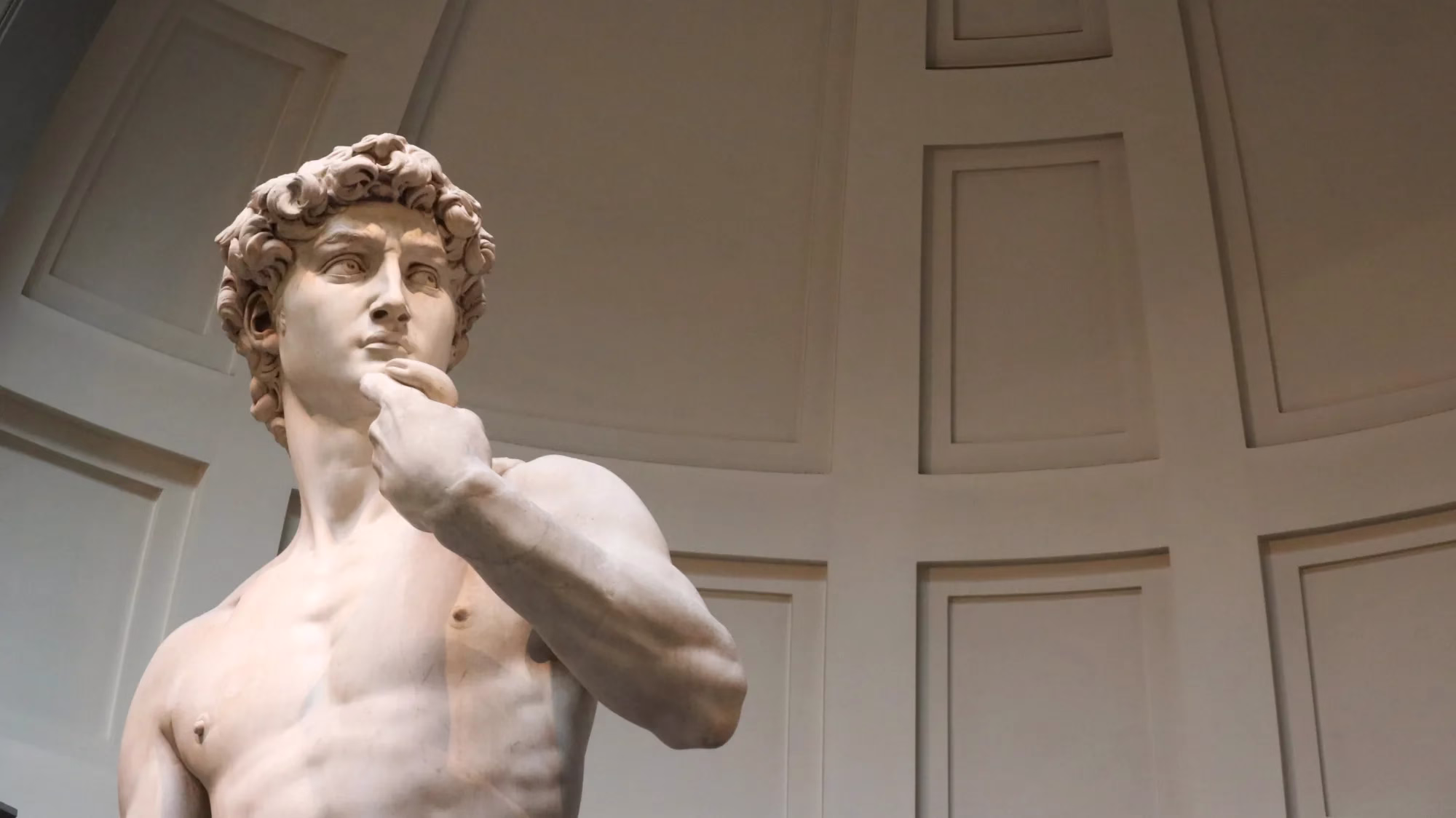As it was destined for the cathedral roof, Michelangelo’s David is big: 517 cm tall and weighing 5560 kilogram. For the same reason, his head is also slightly too big when seen only from this lower level.