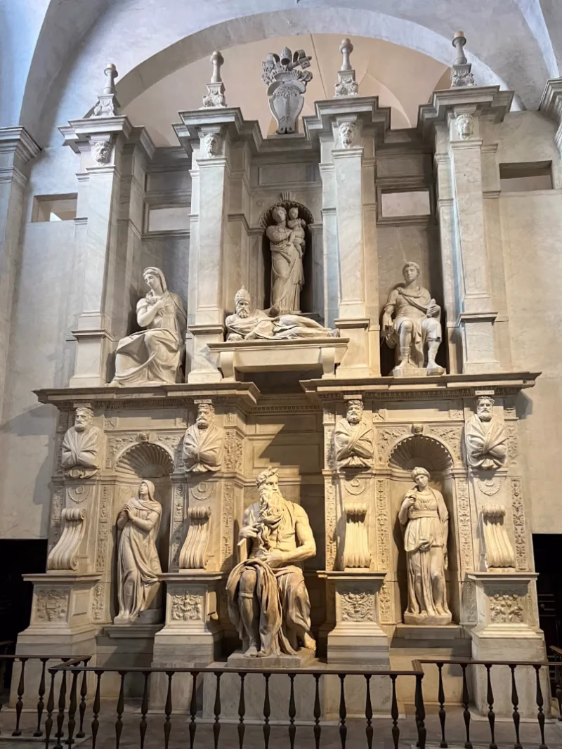 Julius II died in 1513, around the time Michelangelo worked on Moses, and was interned in St Peter’s Basilica in the Vatican City — his grave is now just marked by an epitaph on a simple marble slab. His funerary monument in San Pietro in Vincoli, a church traditionally patronized by the Della Rovere family from which Julius II came, was completed in its far simpler form in 1545.