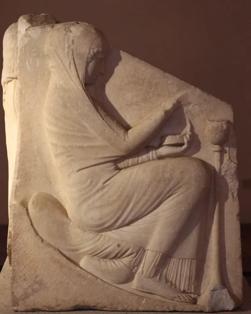 The large relief on the back of the block shows Aphrodite rising from the sea (or the birth of Venus Anadyomene) with the help of two assistants. On the side panels are a nude woman with crossed legs playing the aulas (double flute) and a cloaked woman with an incense burner. These are generally interpreted as priestesses of Aphrodite and representing profane and sacred love.