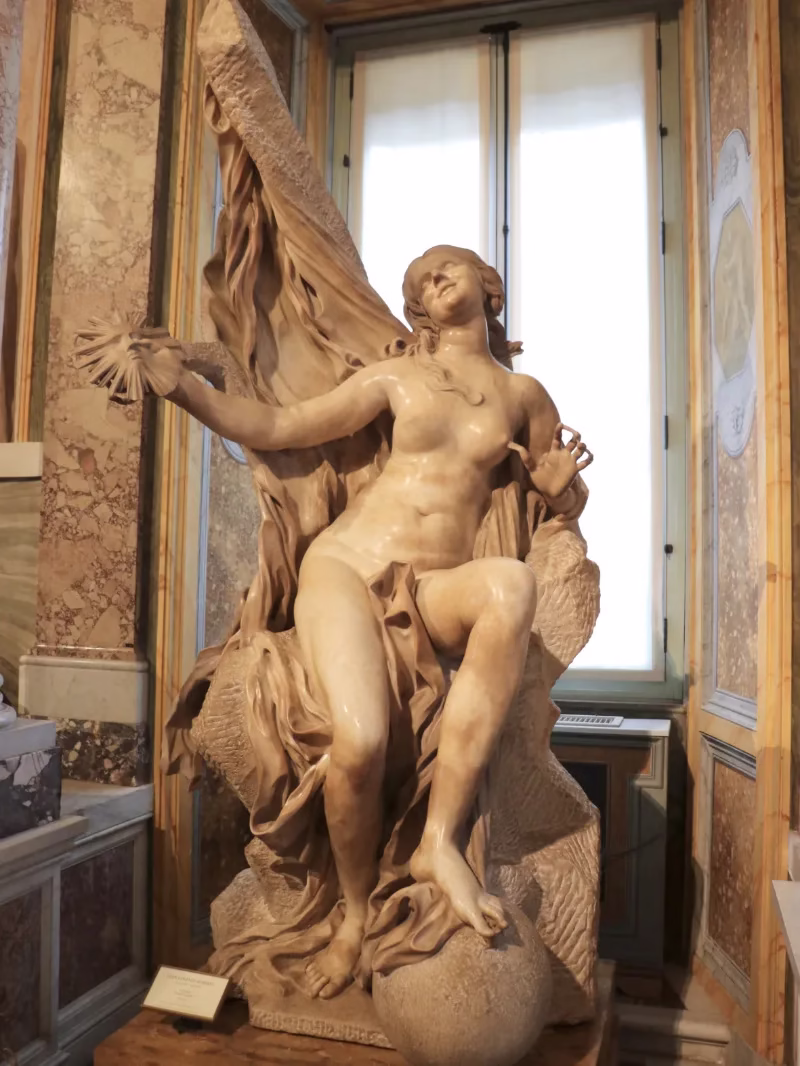 Bernini never completely finished Truth Unveiled by Time (1645–1652). This huge 277 cm (109 in) marble sculpture features Truth, allegorically as a naked young woman, already unveiled but for some cloth covering the groin. She holds a sun in her right hand. A winged figure or Father Time was supposed to have pulled the clothes away but it was never completed.