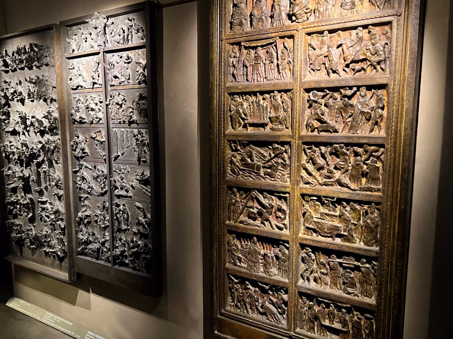 A final exhibition in the Duomo Museum shows the proposals for the fifth and last door of the Duomo, which marked the end of construction in 1965. In a competition reminding of Ghiberti and Brunelleschi’s designs for the Gates of Paradise doors of the Baptistery in Florence, artists presented proposals. In the final round, the designs of Luciano Minguzzi won over the more modern proposals of Lucio Fontana. Fontana’s ideas were appreciated but “deemed too far from the traditional language of the existing doors”. (Fontana has a dedicated room in the nearby Museo del Novecento.)