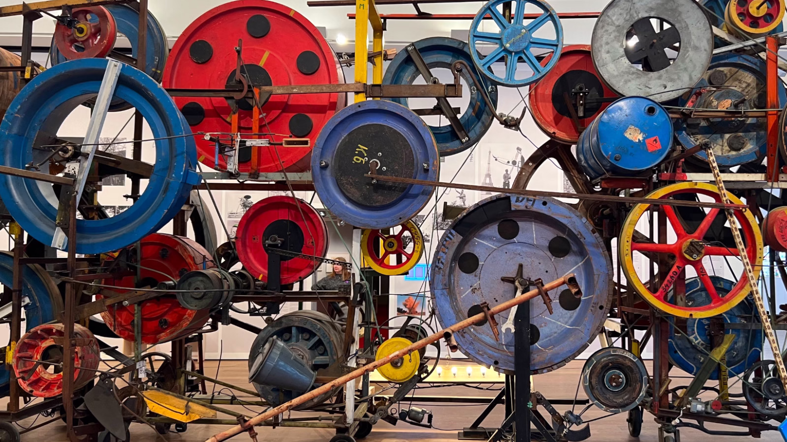 Material / technique: Iron frame, wooden wheels, plastic parts, percussion instruments, light bulbs, electric motors